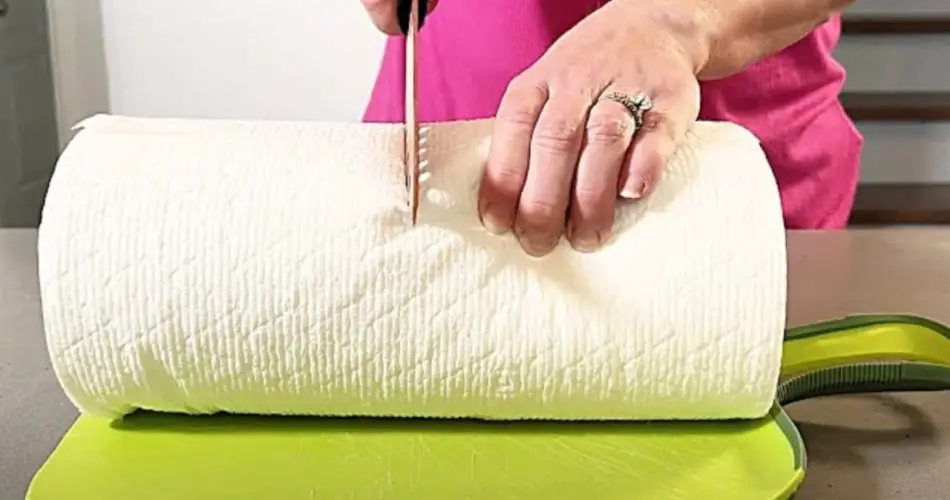 Next, you will need a cutting board and a paring knife. You may be wondering what these two tools are for. You will need them to cut the roll in half . While it may seem the size of toilet paper, your paper towel will now serve the same purpose, but can be used twice as many times.