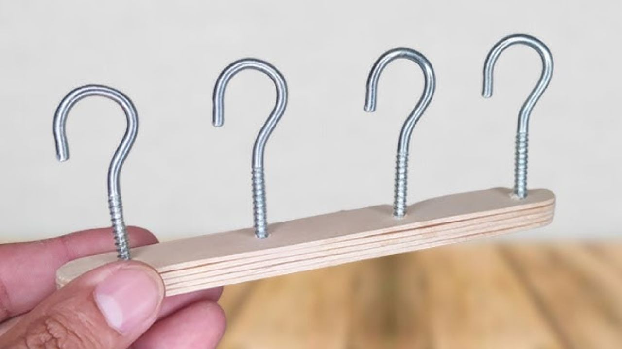 Make the small holes and insert 4 screw hooks inside them and fix everything . The other wooden sticks can act as a decorative support for this small creation with the hooks that we have just mentioned.